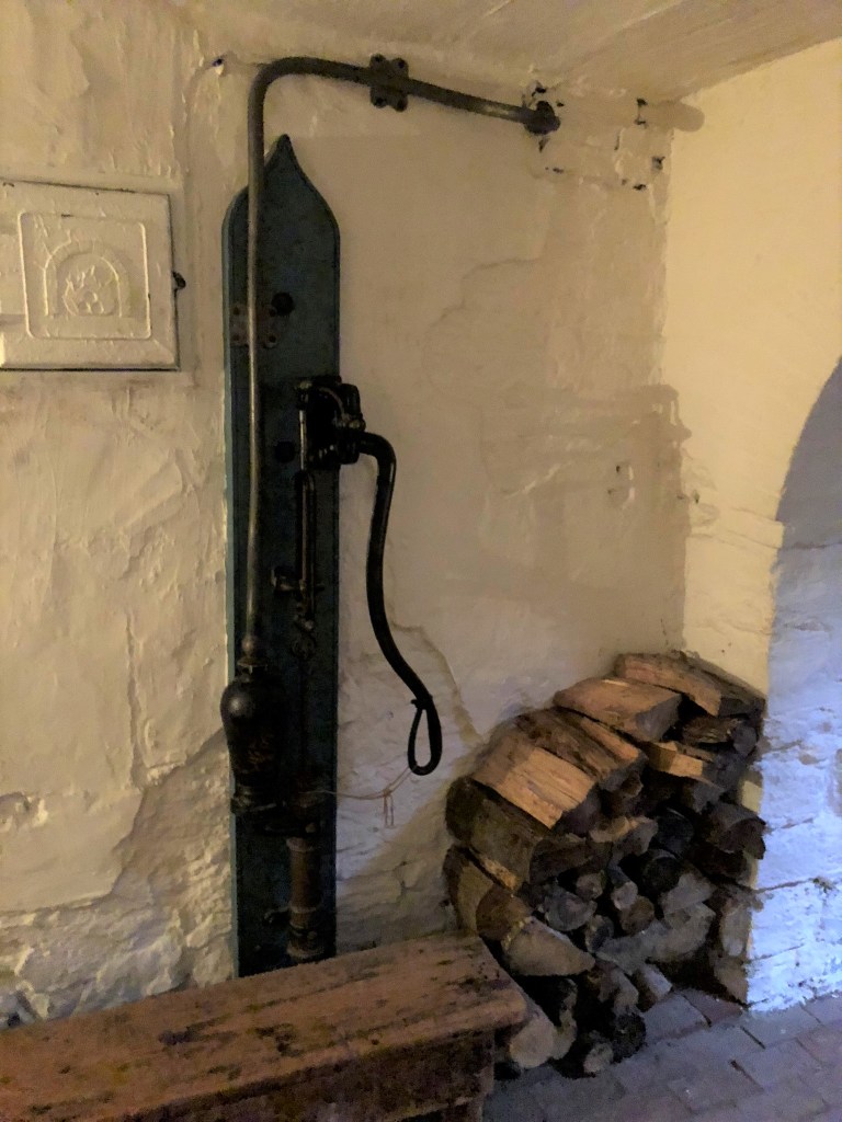 The joys of modern indoor plumbing. Remember, there was no electricity yet. When the family used the water system, a young staff member manned the hand pump shown in the last photo to provide a constant flow of water!