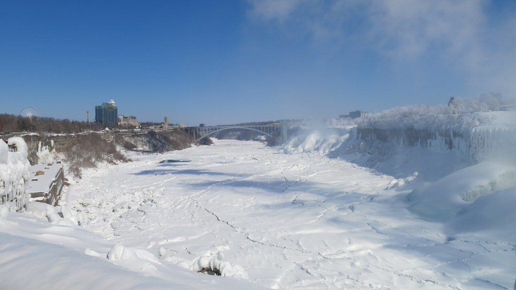 We stopped walking when we were halfway across the Rainbow bridge one summer and took this picture. The American Falls on the left and the Canadian Horseshoe Falls in the background. The Maid of the Mist boat tours taking visitors to the base of the falls. We continued walking across the bridge to the U.S side visiting the Niagara Falls State Park taking in views of the Canadian side. The winter photo was taken at the crest of the Horseshoe Falls looking back at the Rainbow bridge.