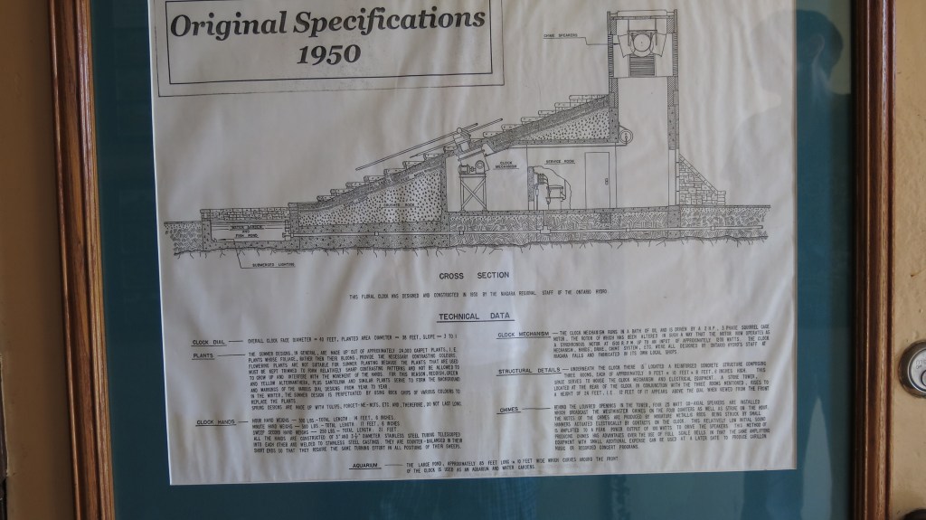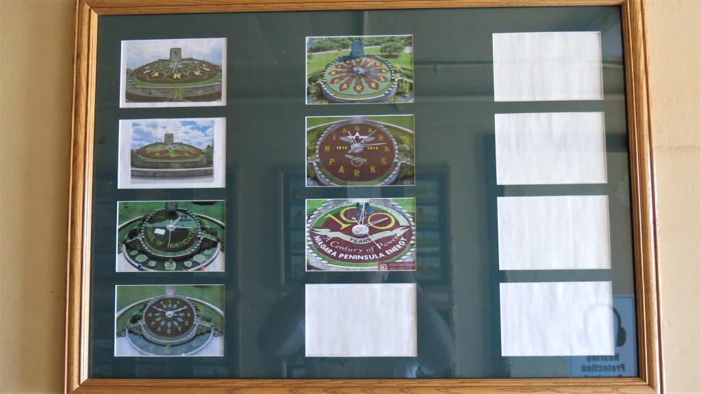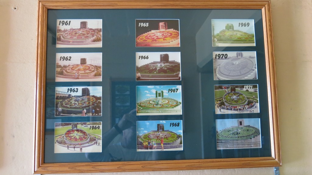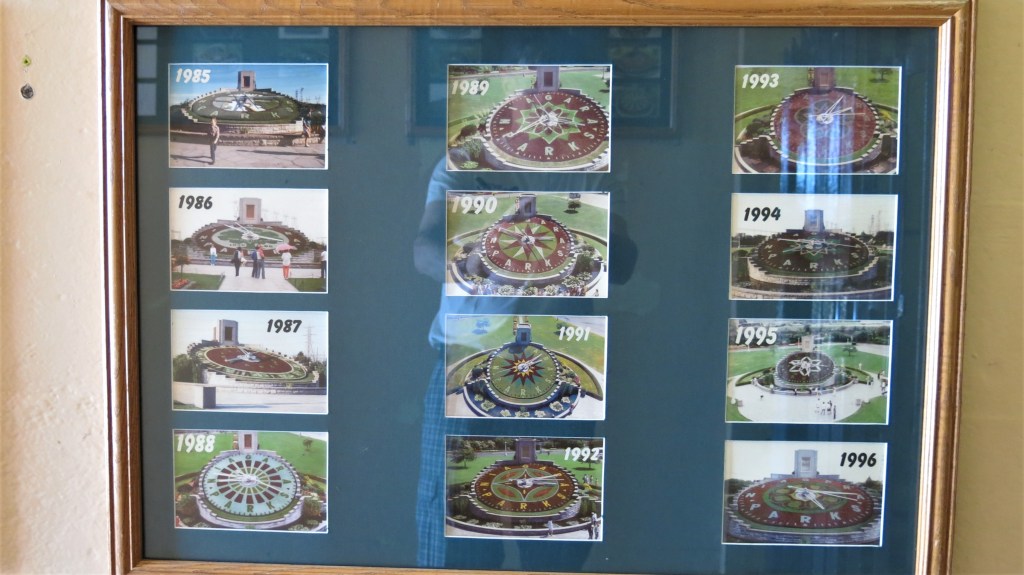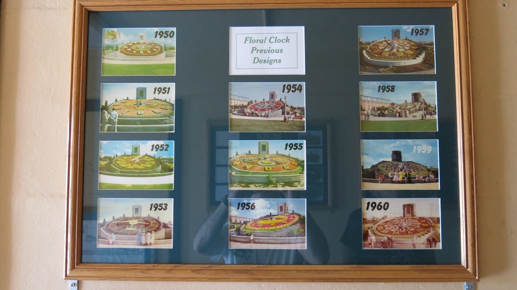 One year we visited and found the door to the clock’s mechanical room open. Inside the room we saw these photos placed inside picture frames showing the floral clocks from years 1950 to the year we made this visit in 2016.