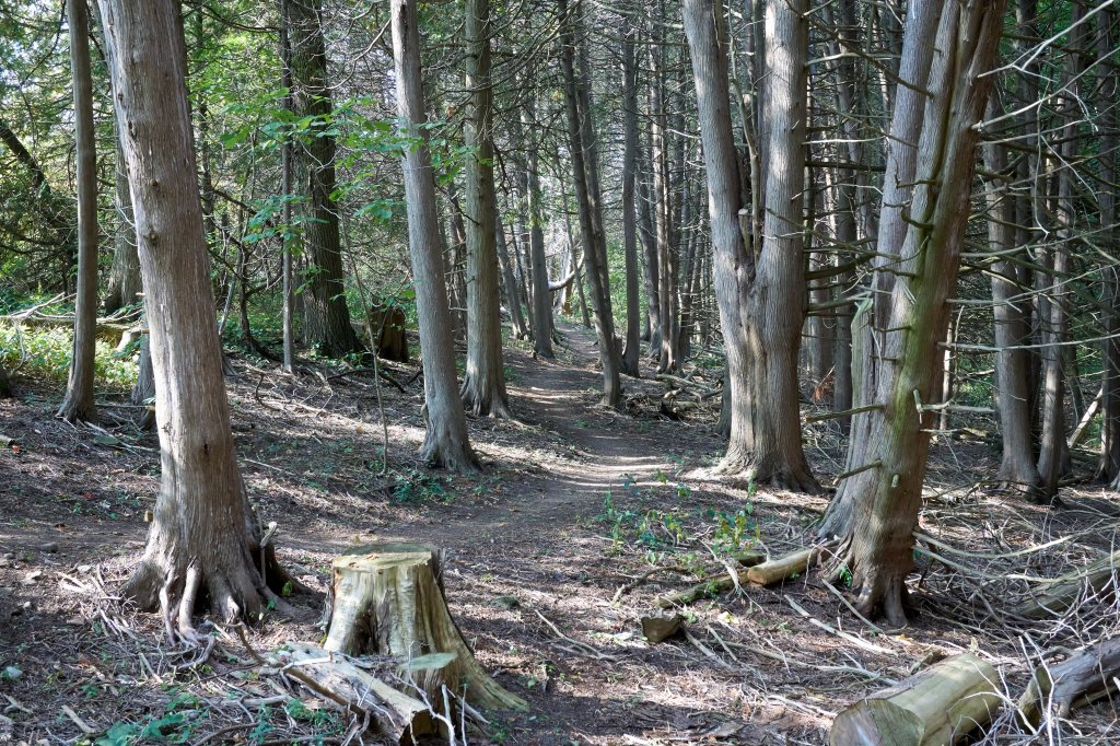 The Monarch trail offers two distinctly different terrains to discover.  One is a quiet, dense old growth cedar forest. A natural forest floor trail weaves through cedar trees with the occasional wooden bridge elevated just above swamp areas.  The other trail section is paved, guiding visitors to open vistas of wild flowers, farmers fields and a combination of small and large trees. A breeze blowing through the flora combined with the warming strength from the sun creates a restorative scene.