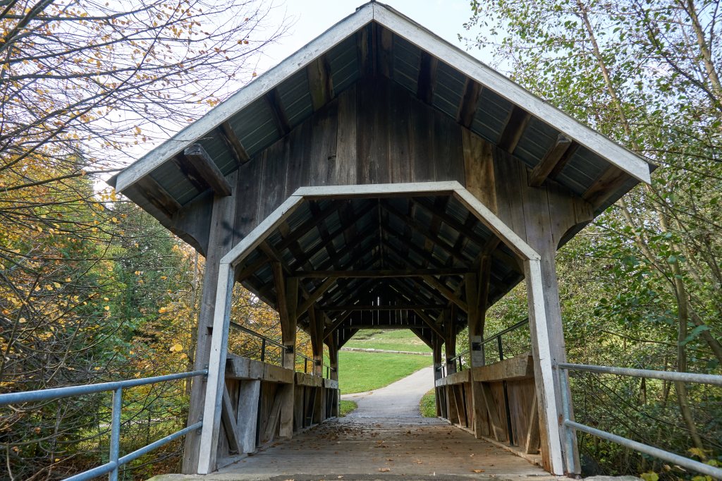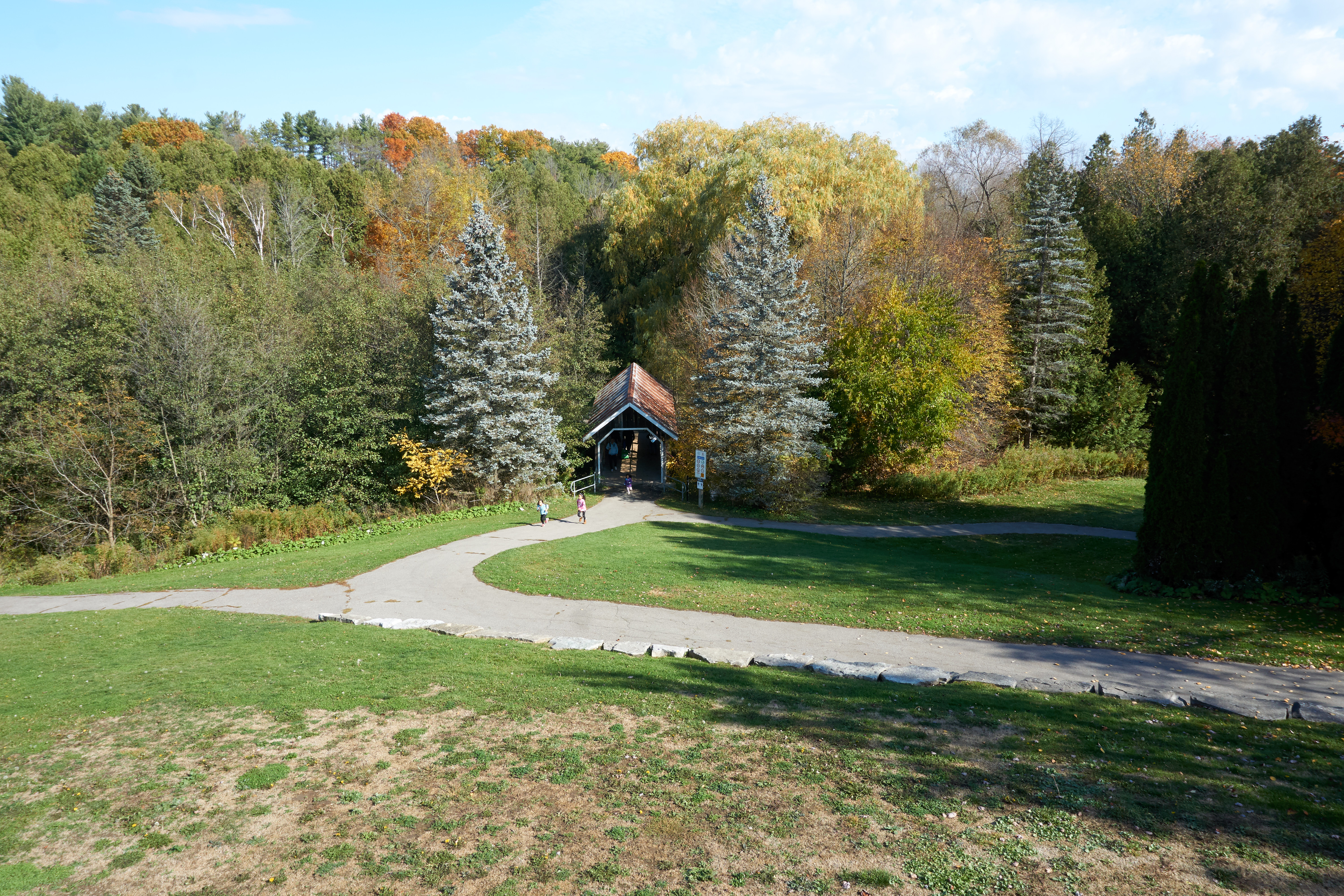 Autumn 1997 to Autumn 2020. Swipe up and down. Compare the size of the pine trees at the Kissing Bridge. To the left of the bridge Mother Nature has taken over by planting shrubbery along the Lynde Creek’s edge.