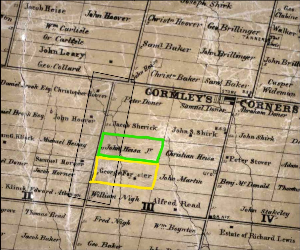 Historical records show the Phyllis Rawlinson Park is located on lot 32 on the 3rd concession (yellow rectangle). Other historical records show the Rawlinson family may have also owned the adjacent lot to the north, lot 33 on the 3rd concession (green rectangle), altogether adding up to approximately 185 acres.