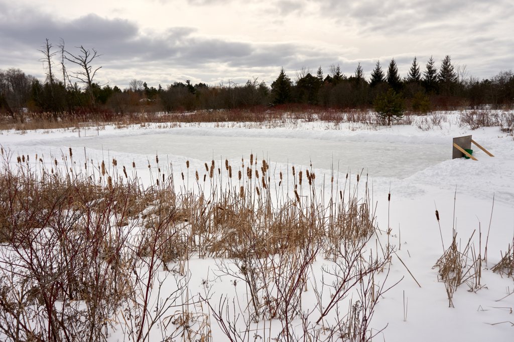 Boardwalks cross over unnamed tributaries of the Rouge River feeding into the pond. The water temperature in the pond has consistently stayed below 0 degrees C. and has created a natural ice-skating rink. With assistance from The Rouge Valley Foundation and its volunteers some sections of the park are being returned to a forested setting from its previous pastural farm use.