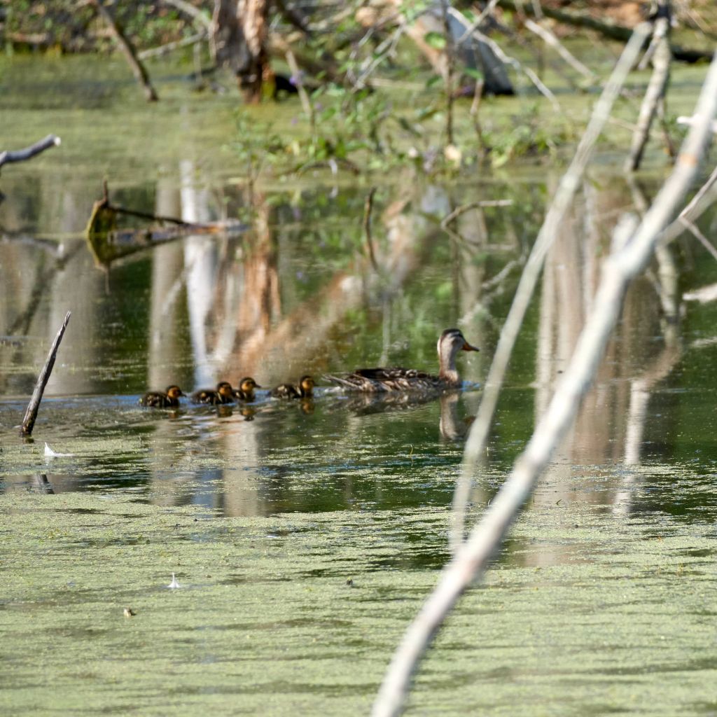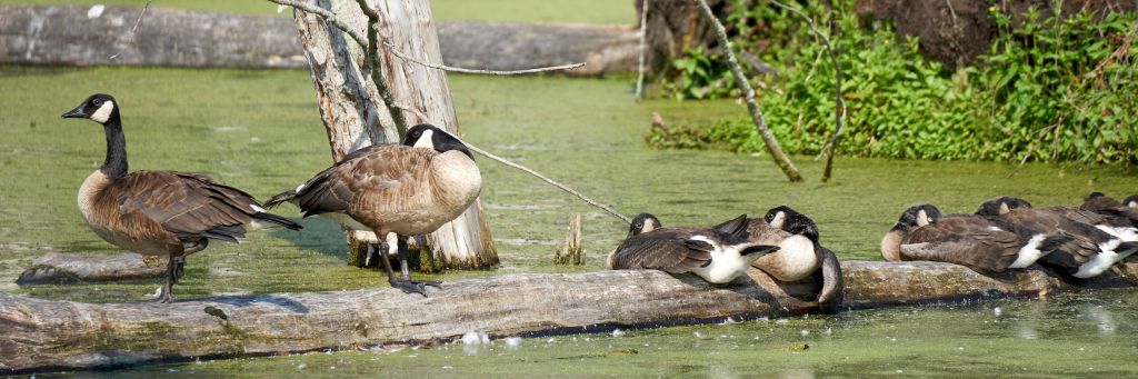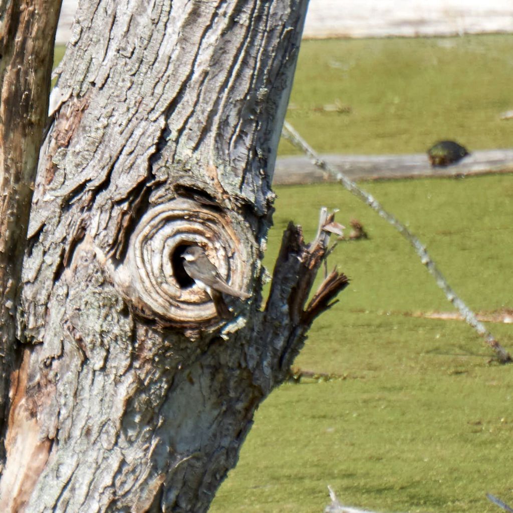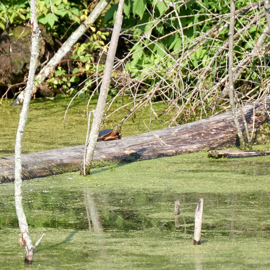 Though this green swamp may give the appearance of a dead zone, there’s a lot of wildlife present. On the water surface, I see turtles sunning themselves on fallen trees. In a far corner of the pond a gaggle of Canada geese are tending their young. A tree swallow is feeding its fledglings nesting inside one of the upright rotting trees. A duck and duckling paddled by in front of me.  I even saw a beaver or maybe it was a muskrat dive underwater as I arrived today. It was all so fast, I couldn’t be sure.