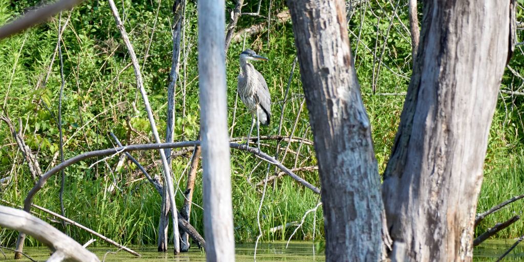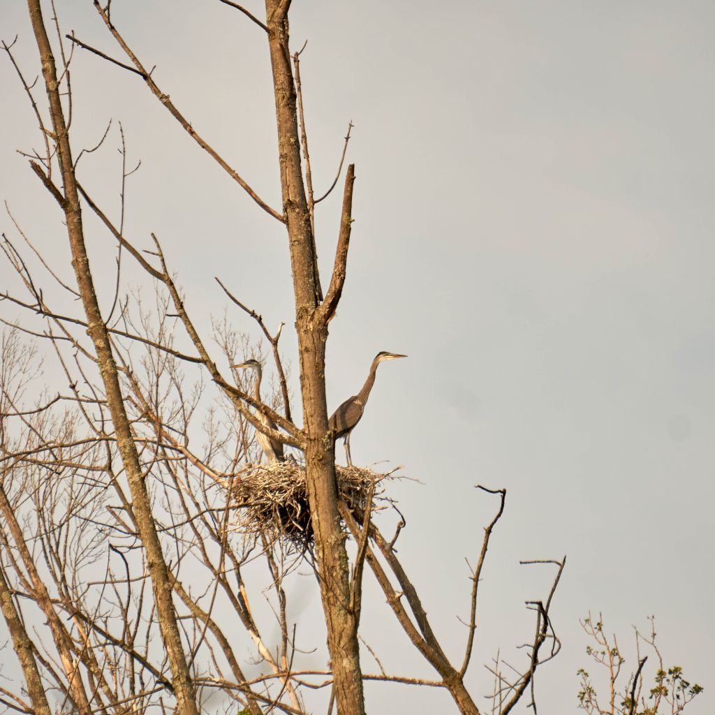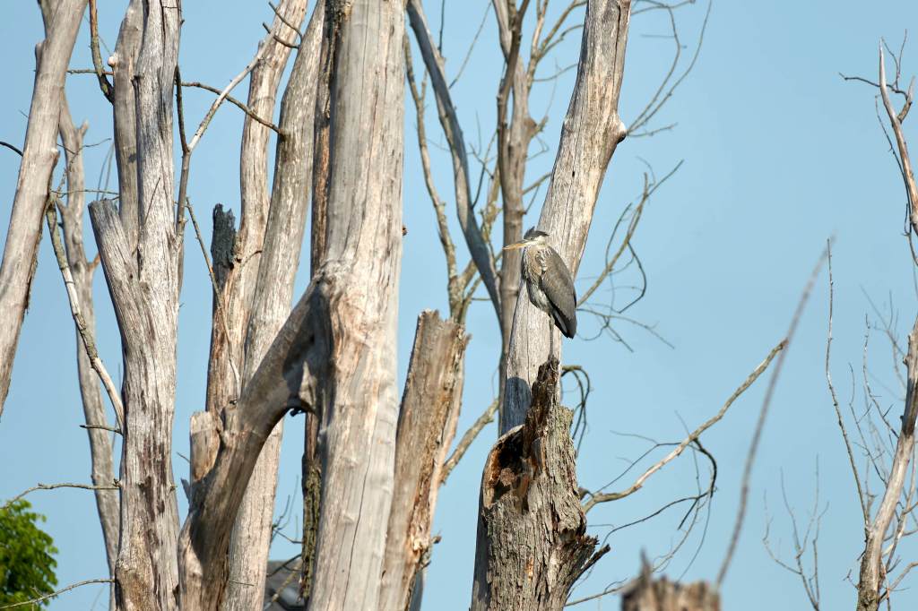 My time with the great blue herons has drawn to an end.  All the babies have flown the coop.  As I scanned over the pond’s surface and into the trees it took a little time before I could see a few herons. When they are standing still, they seamlessly blend into the landscape. The bird’s contrast against the bright blue sky had made them easy to see. It hadn’t yet occurred to me how much their plumage is the same dull gray colour as the surrounding dead swamp trees. It’s fascinating how such large birds are easily camouflaged by their colouring.