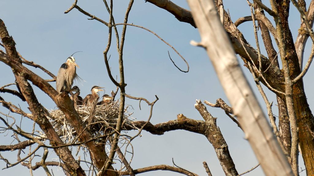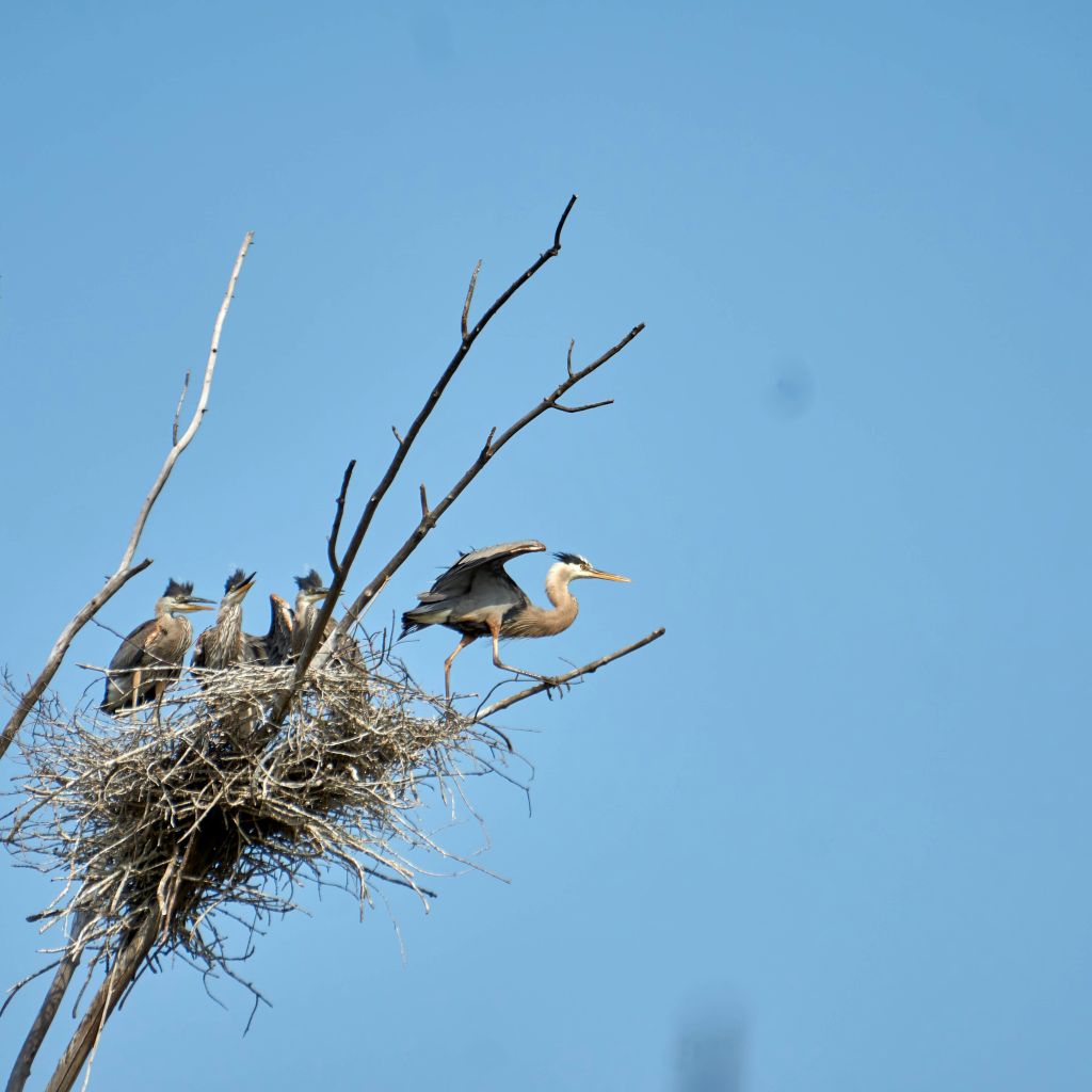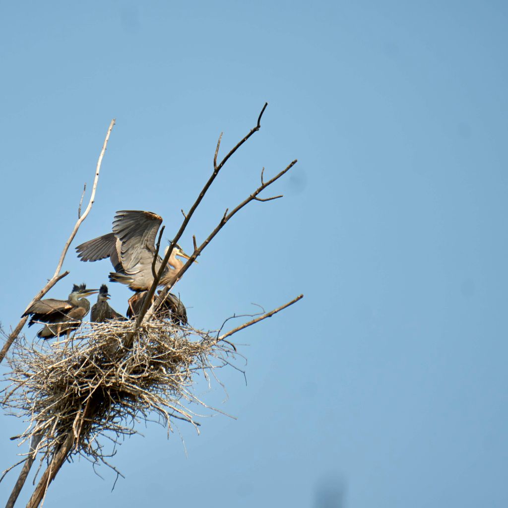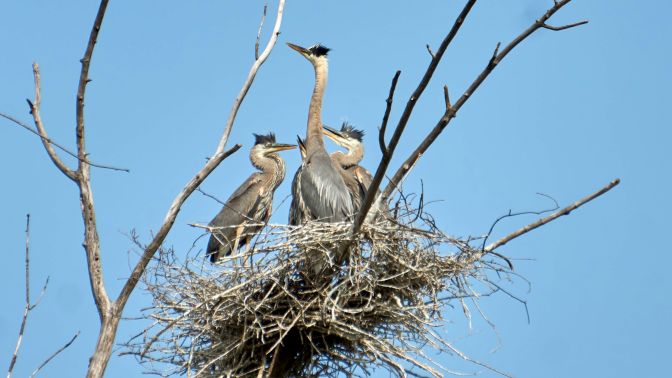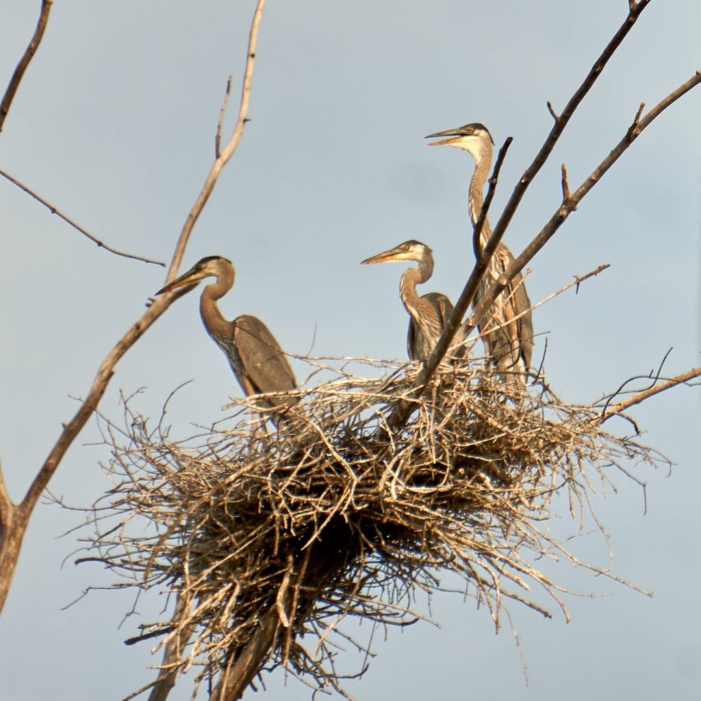 By fall, as temperatures cool, they’ll begin their several weeks long migratory flight south to the lower United States and Mexico. Colonies generally winter in the same geographical regions each year. Come spring, these offspring and parents will return to this nesting area. In two to three years time these young herons will have matured and will be ready to raise future generations of great blue herons.