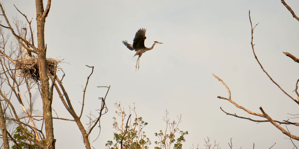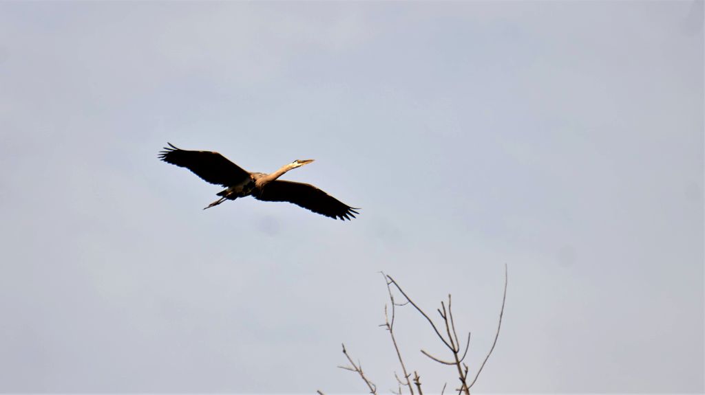 A great blue heron soars pass me on its way to feed hungry chicks.