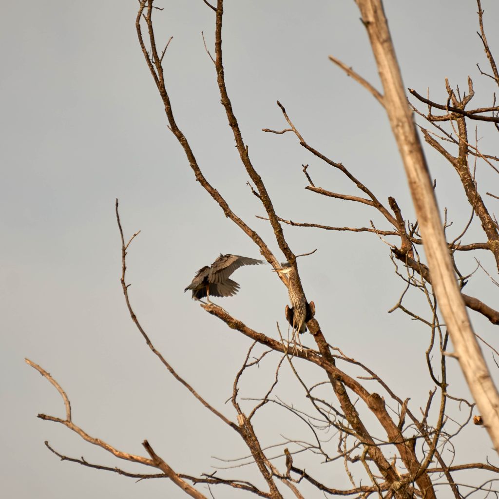From both locations the nest bound herons extended their wings and leaned forward in preparation for their first flight. It really will be a leap of faith for the nestling. If it doesn’t get it right the first time, below lies an unwelcoming, slimy green watery swamp. Fingers crossed they all succeed.