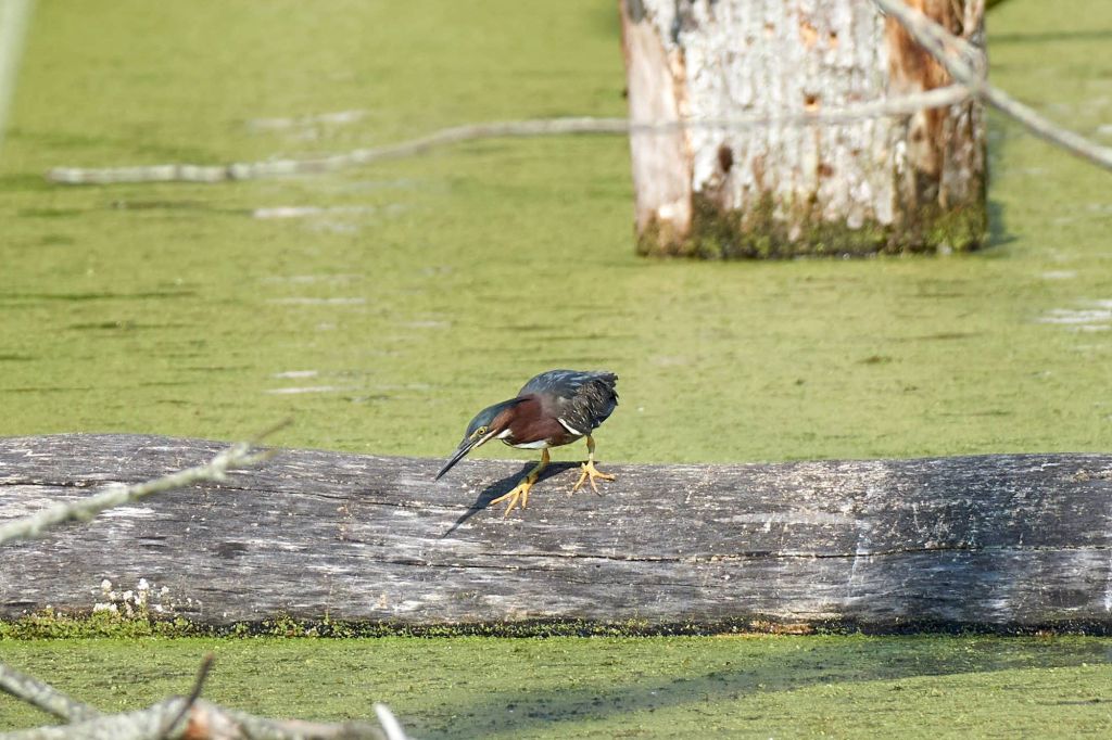 Before you go, I saw a different heron today. This one is a green heron and it’s waiting patiently for a small fish. Green herons will actually bait their prey by dropping insects, twigs or other floating items to lure its catch.
