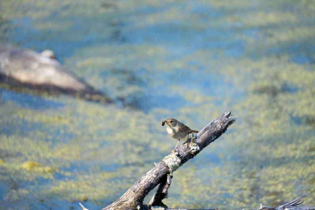Watching them begin to fend for themselves with a parent’s cues will be the next critical lessons. At a far end of the pond, one of the young birds used a fallen tree as its fishing perch. The tree laid flat at the water surface with it’s roots and clinging muddy soil exposed. Slowly the blue heron’s head moved closer to the surface of the pond, peering into the green water as it tracked its prey. Suddenly, it’s S shaped neck quickly straightened, snapping just beneath the water surface. No catch, more practice will be essential.